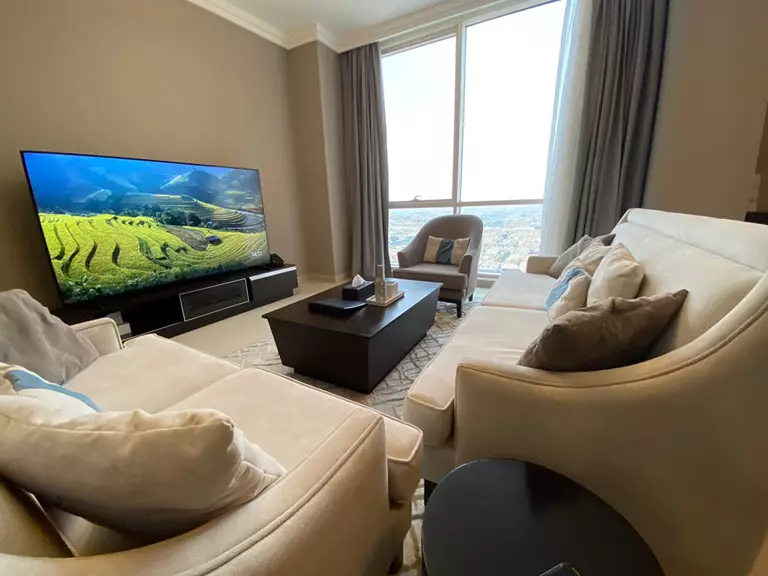 أعلى مواصفات بالبرج ، تتميز بشاشة في الصالة مقاس 85 بوصة وأخرى في الغرفتين مقاس 50 بوصة.