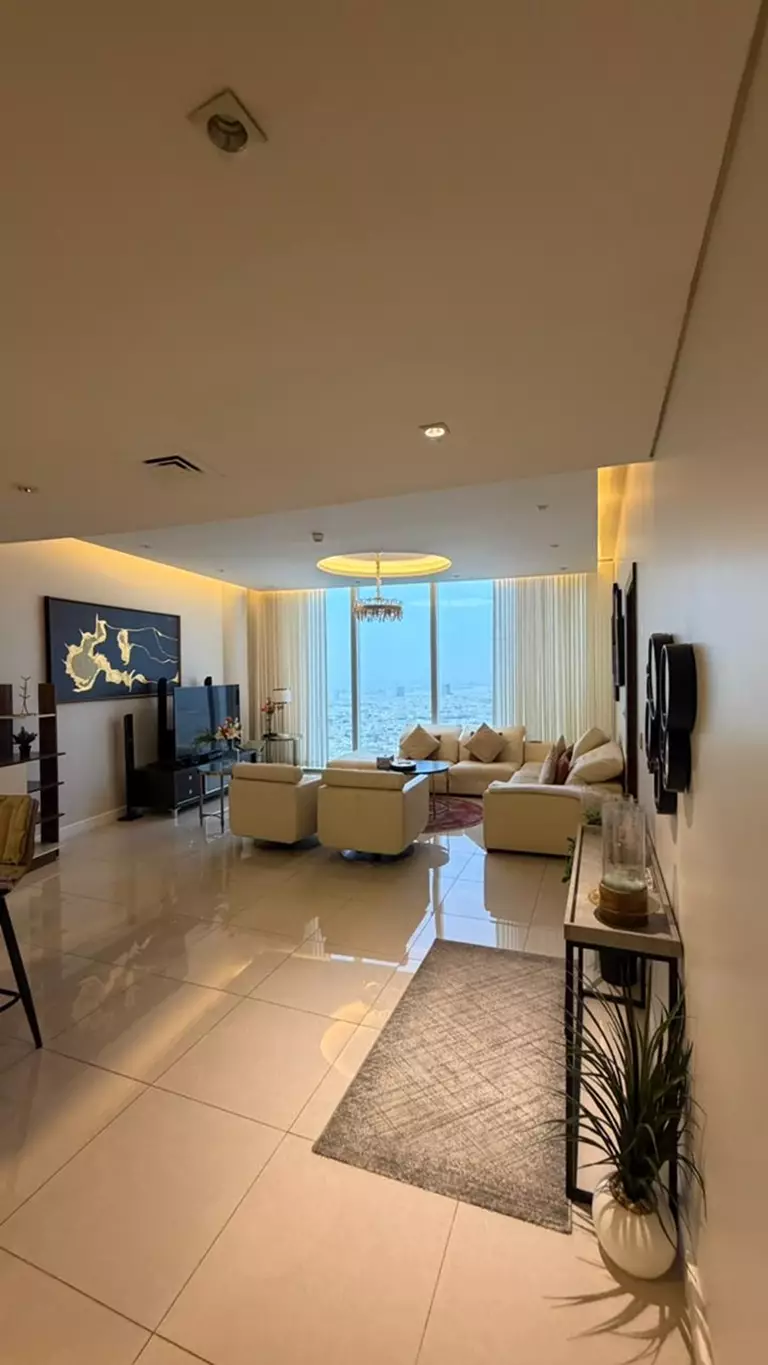 غرفة ماستر بإطلالة + صالة واسعة بإطلالة +مطبخ